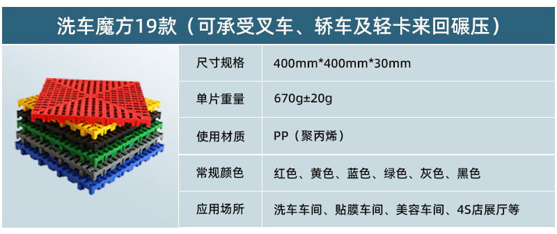 正和19款洗車魔方是正和公司2019年推出的新品,該產(chǎn)品厚度為30毫米,采用更為粗壯的加強筋和更為寬大的面層設計,是目前載重、抗沖擊效果最好的產(chǎn)品。