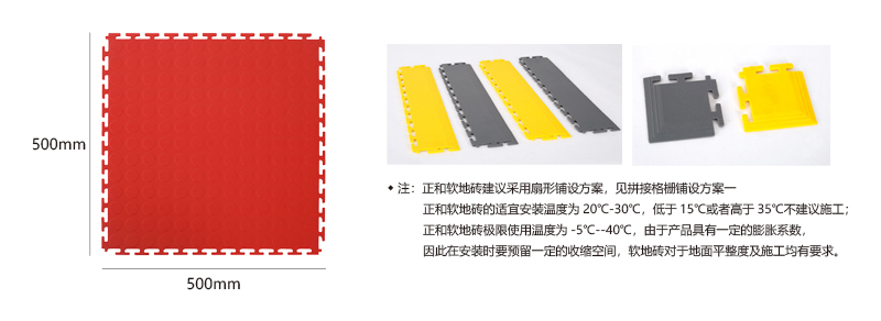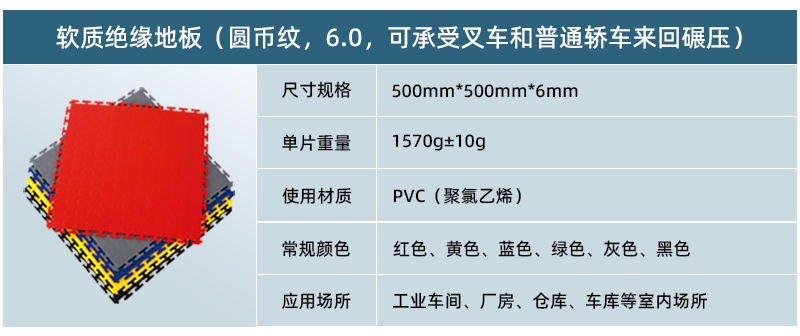 軟質絕緣地板能夠將每個獨立的地板快速拼裝成整體地面,專利型鎖扣結構連接能力更強,可承受叉車的來回碾壓。施工過程中無需膠黏劑等材質,具有施工簡單快速、色彩絢麗、美觀大方、可移動性強、可重復使用等特點。