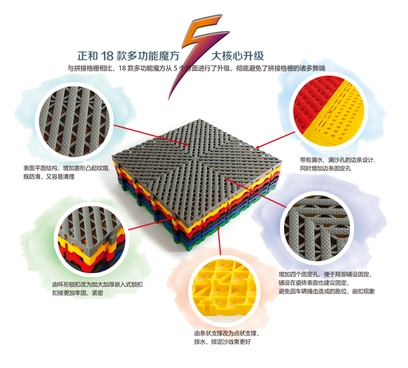 正和18款多功能魔方與拼接格柵十分類似,實(shí)質(zhì)上是對(duì)拼接格柵的本質(zhì)升級(jí),具體區(qū)別如下: 1、拼接格柵為弧形面,而多功能魔方為平面,更容易清理衛(wèi)生; 2、拼接格柵沒(méi)有防滑處理,而多功能魔方表面增加防滑紋設(shè)計(jì); 3、拼接格柵為環(huán)形鎖扣設(shè)計(jì),扣合力小,而多功能魔方采用大鎖扣設(shè)計(jì),扣合更牢固; 4、拼接格柵下方支撐為條形支撐,多功能魔方采用點(diǎn)狀支撐,排水、排泥沙效果更好; 5、拼接格柵局部鋪設(shè)容易滑動(dòng),多功能魔方增加固定孔,局部鋪設(shè)可固定,更牢固; 6、拼接格柵邊條為實(shí)心密封邊條,而多功能魔方為帶孔漏水邊條。 正和18款多功能魔方與拼接格柵相比唯一的不足是:由于是點(diǎn)狀支撐,不能直接鋪設(shè)到玻璃鋼格柵上面。