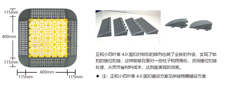 正和小四葉草4.0圓扣采用通扣設計,可以確保產(chǎn)品鋪設完成后在任何區(qū)域單獨取出,極大的方便了客戶后期局部清理泥沙等,給店面的日常衛(wèi)生維護提供了很好的基礎。